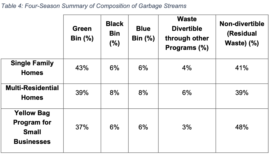 In general, we’re not diverting enough—particularly organics. The Audit data indicates that from 37 percent (Yellow Bag Program) to 43 percent (single-family homes) of garbage sent to landfill are organics that should be in our green bin. We’re doing better with black bin and blue bin materials: only 6 to 8 percent (in each category) of what’s going to landfill constituted these materials.